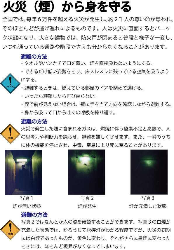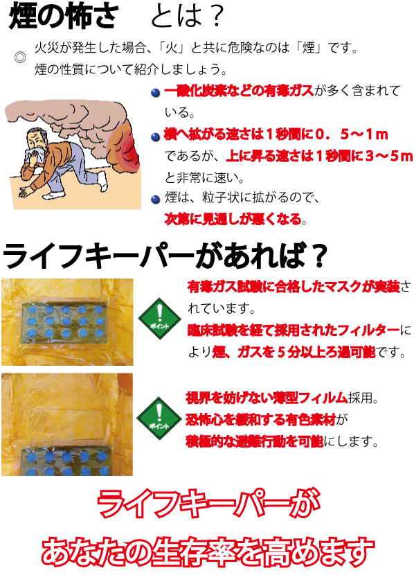 ![]() 有毒ガスや煙を吸い込む事は防げますが 目に入り避難行動をとる事ができません。 |